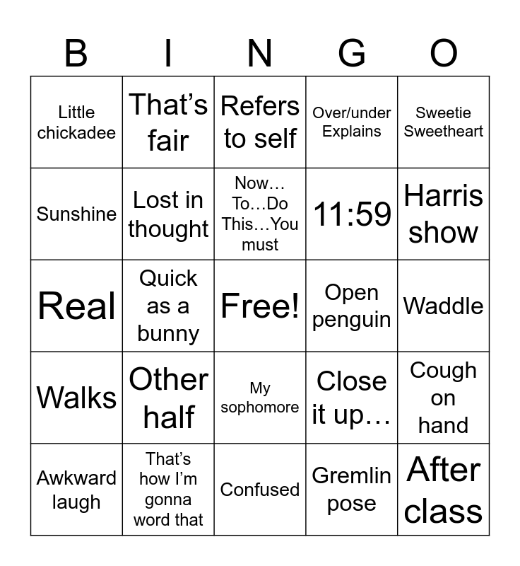 This bingo card has a free space and 24 words: Other half, That’s how I’m gonna word that, Now… To…Do This…You must, Awkward laugh, Sweetie Sweetheart, Little chickadee, Sunshine, That’s fair, Open penguin, My sophomore, 11:59, Real, Close it up…, Cough on hand, Lost in thought, Gremlin pose, Waddle, Refers to self, Harris show, Quick as a bunny, After class, Walks, Over/under Explains and Confused.
