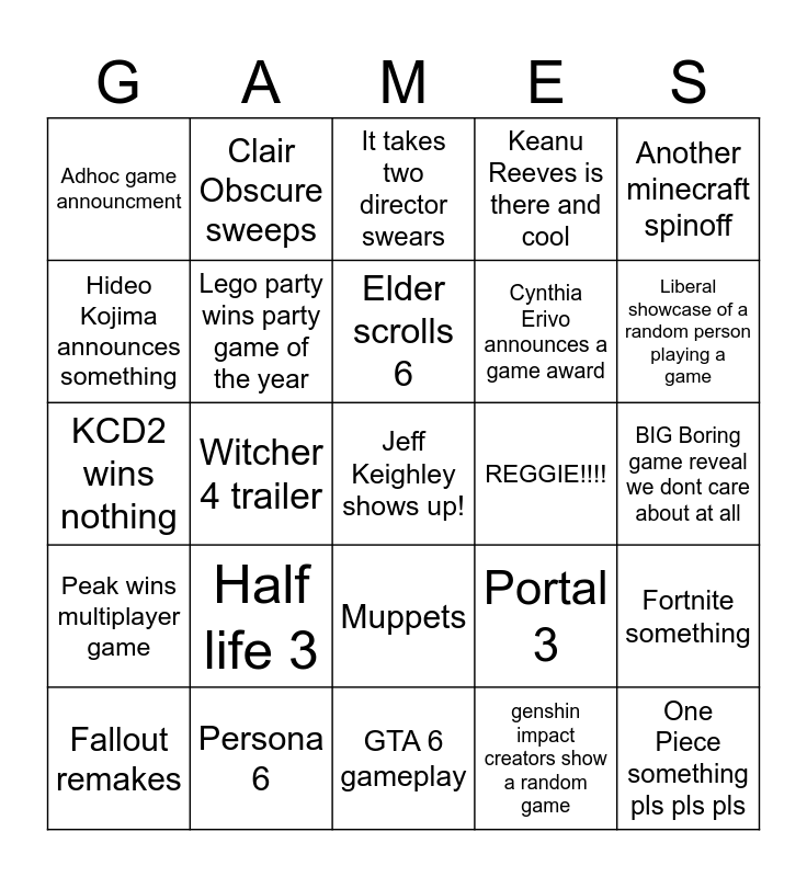 This bingo card has a free space and 24 words: Half life 3, Persona 6, Elder scrolls 6, Fallout remakes, Another minecraft spinoff, Adhoc game announcment, Hideo Kojima announces something, Clair Obscure sweeps, REGGIE!!!!, Muppets, Cynthia Erivo announces a game award, KCD2 wins nothing, Portal 3, Fortnite something, Lego party wins party game of the year, genshin impact creators show a random game, BIG Boring game reveal we dont care about at all, It takes two director swears, Liberal showcase of a random person playing a game, Witcher 4 trailer, One Piece something pls pls pls, Peak wins multiplayer game, Keanu Reeves is there and cool and GTA 6 gameplay.