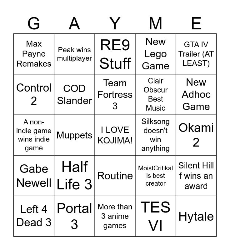 This bingo card has a free space and 24 words: Half Life 3, Portal 3, Team Fortress 3, Left 4 Dead 3, GTA IV Trailer (AT LEAST), Max Payne Remakes, Control 2, Peak wins multiplayer, Silksong doesn't win anything, Routine, Clair Obscur Best Music, A non-indie game wins indie game, MoistCritikal is best creator, Silent Hill f wins an award, COD Slander, TES VI, Okami 2, RE9 Stuff, New Adhoc Game, Muppets, Hytale, Gabe Newell, New Lego Game and More than 3 anime games.