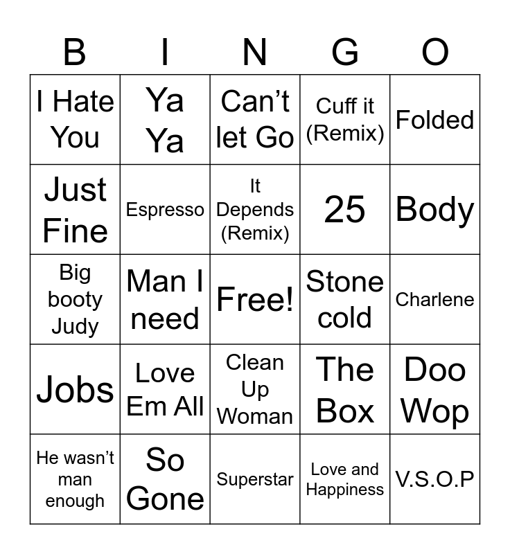 This bingo card has a free space and 36 words: BMO, Track Star, Take Me Thru Dere, Espresso, The Box, Jobs, It Depends (Remix), Gnarly, Folded, Passport Junkie, Man I need, Cuff it (Remix), Good love, Stone cold, Body, I Hate You, Good Days, Love Em All, V.S.O.P, Can’t let Go, Charlene, Doo Wop, So Gone, He wasn’t man enough, Superstar, Ya Ya, Big booty Judy, FTCU, 25, Just Fine, Somebody, Slow Motion, Love and Happiness, Clean Up Woman, Pick Up Your Feelings and Walked In.