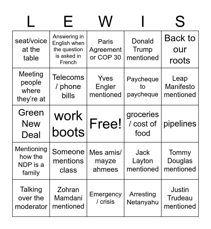 This bingo card has a free space and 27 words: Jack Layton mentioned, Stephen Harper mentioned, Paycheque to paycheque, Emergency / crisis, Meeting people where they’re at, Paris Agreement or COP 30, Answering in English when the question is asked in French, Mentioning how the NDP is a family, groceries / cost of food, Tommy Douglas mentioned, Green New Deal, Donald Trump mentioned, Talking over the moderator, Zohran Mamdani mentioned, Leap Manifesto mentioned, Canada is X number of companies in a trench coat, Telecoms / phone bills, Yves Engler mentioned, Someone mentions class, seat/voice at the table, pipelines, Arresting Netanyahu, work boots, Justin Trudeau mentioned, Mes amis/ mayze ahmees, Back to our roots and Consult with the membership.