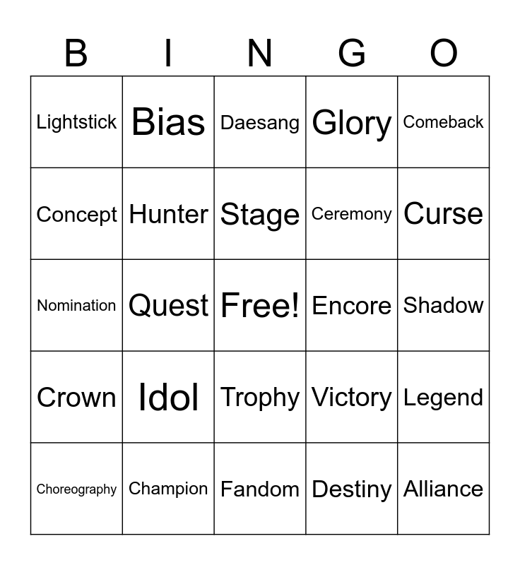 This bingo card has a free space and 25 words: Idol, Fandom, Stage, Choreography, Comeback, Lightstick, Concept, Bias, Encore, Trophy, Ceremony, Nomination, Victory, Legend, Hunter, Blade, Shadow, Daesang, Curse, Quest, Alliance, Champion, Crown, Glory and Destiny.
