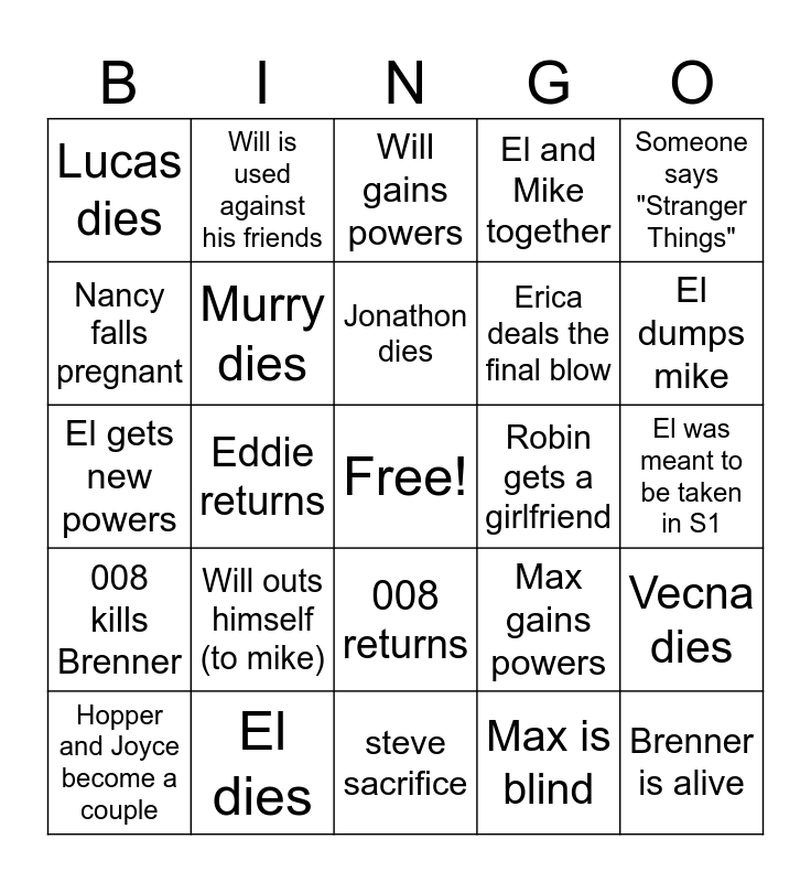This bingo card has a free space and 24 words: Will outs himself (to mike), El dies, Jonathon dies, Hopper and Joyce become a couple, Someone says "Stranger Things", Lucas dies, Nancy falls pregnant, Will is used against his friends, Robin gets a girlfriend, 008 returns, Erica deals the final blow, El gets new powers, Max gains powers, Vecna dies, Murry dies, Max is blind, El was meant to be taken in S1, Will gains powers, El dumps mike, Eddie returns, Brenner is alive, 008 kills Brenner, El and Mike together and steve sacrifice.