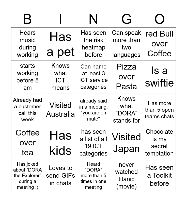 This bingo card has a free space and 24 words: Has kids, Loves to send GIFs in chats, Can name at least 3 ICT service categories, Has joked about “DORA the Explorer” during a meeting ;), red Bull over Coffee, Hears music during working, starts working before 8 am, Has a pet, Knows what "DORA" stands for, has seen a list of all 19 ICT categories, Pizza over Pasta, Already had a customer call this week, Visited Japan, Chocolate is my secret temptation, Knows what "ICT" means, never watched titanic (movie), Has more than 5 open teams chats, Has seen the risk heatmap before, Is a swiftie, Visited Australia, Has seen a Toolkit before, Coffee over tea, Can speak more than two languages and Heard “DORA” more than 5 times in one meeting.
