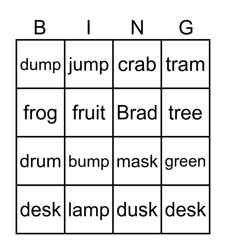 This bingo card has 17 words: dusk, desk, crab, dump, bump, tram, green, Brad, tree, fruit, lamp, mask, frog, jump, drum, drag and desk.