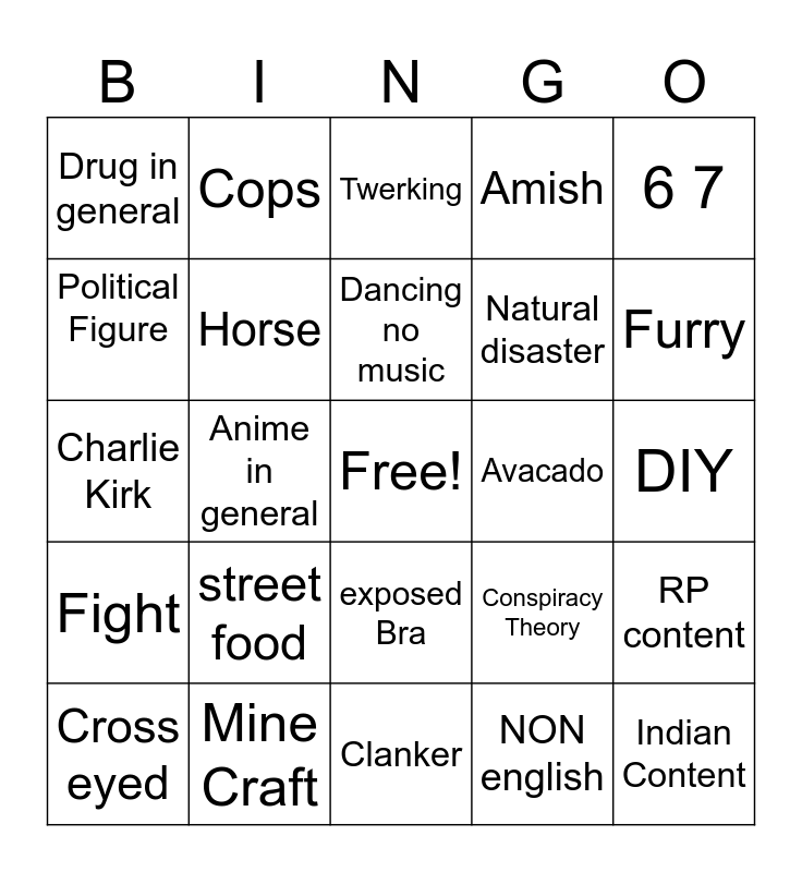 This bingo card has a free space and 24 words: street food, Mine Craft, Dancing no music, Cross eyed, 6 7, Drug in general, Political Figure, Cops, Avacado, exposed Bra, Natural disaster, Charlie Kirk, Conspiracy Theory, RP content, Horse, NON english, DIY, Twerking, Furry, Anime in general, Indian Content, Fight, Amish and Clanker.