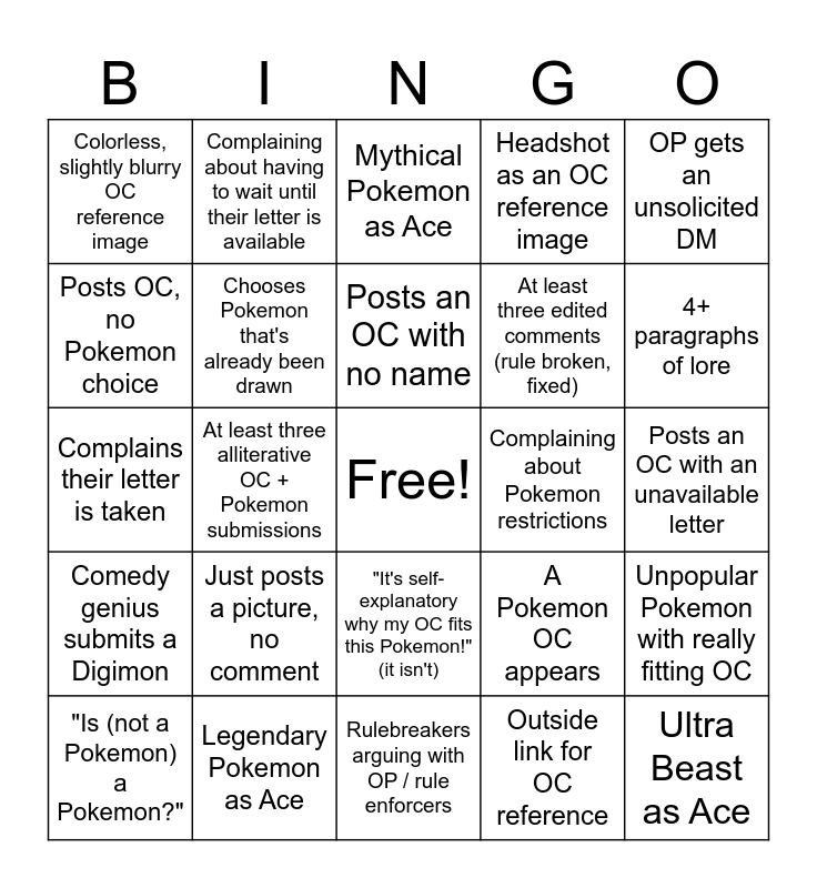 This bingo card has a free space and 24 words: Just posts a picture, no comment, Legendary Pokemon as Ace, Posts an OC with no name, "Is (not a Pokemon) a Pokemon?", OP gets an unsolicited DM, Colorless, slightly blurry OC reference image, Posts OC, no Pokemon choice, Complaining about having to wait until their letter is available, Complaining about Pokemon restrictions, "It's self-explanatory why my OC fits this Pokemon!" (it isn't), At least three edited comments (rule broken, fixed), Complains their letter is taken, A Pokemon OC appears, Unpopular Pokemon with really fitting OC, Chooses Pokemon that's already been drawn, Outside link for OC reference, Posts an OC with an unavailable letter, Mythical Pokemon as Ace, 4+ paragraphs of lore, At least three alliterative OC + Pokemon submissions, Ultra Beast as Ace, Comedy genius submits a Digimon, Headshot as an OC reference image and Rulebreakers arguing with OP / rule enforcers.
