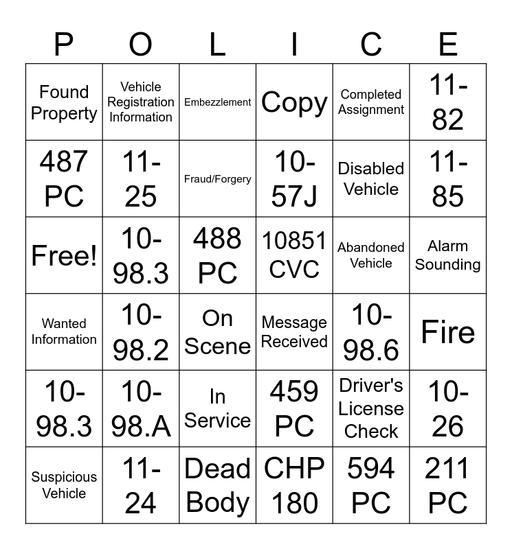 This bingo card has 36 words: 459 PC, In Service, CHP 180, 487 PC, Wanted Information, 10851 CVC, 11-25, Dead Body, Completed Assignment, Driver's License Check, 11-85, Copy, 10-26, 10-98.3, 10-57J, Found Property, 10-98.3, Abandoned Vehicle, Free!, Embezzlement, 488 PC, 10-98.2, Message Received, On Scene, 10-98.6, Vehicle Registration Information, Disabled Vehicle, 11-24, Fraud/Forgery, 11-82, 211 PC, Suspicious Vehicle, Fire, Alarm Sounding, 10-98.A and 594 PC.