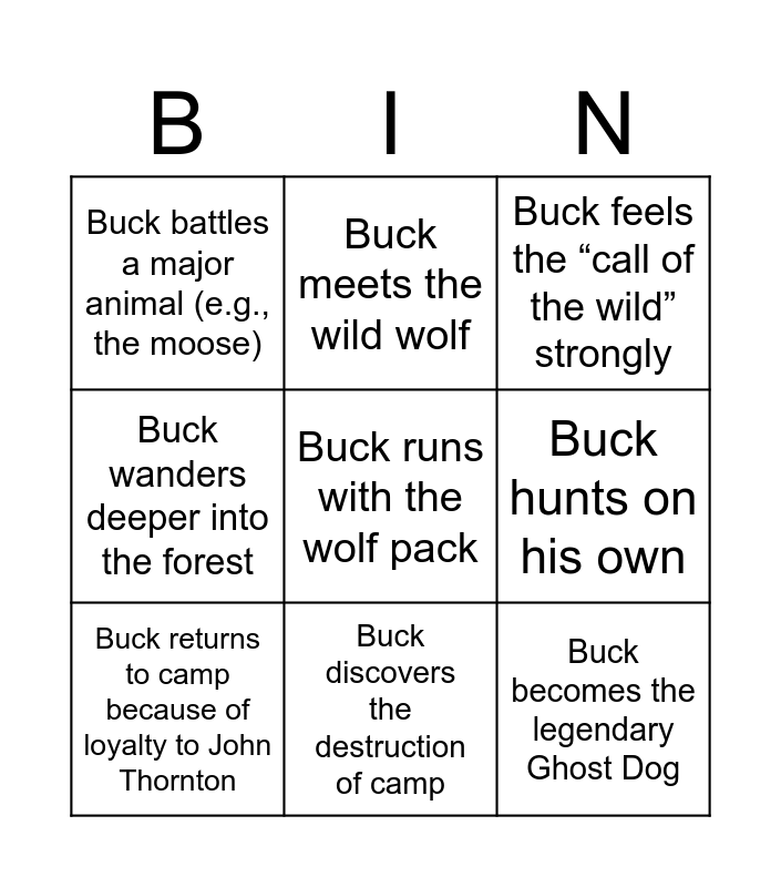 This bingo card has a free space and 8 words: Buck wanders deeper into the forest, Buck meets the wild wolf, Buck hunts on his own, Buck returns to camp because of loyalty to John Thornton, Buck feels the “call of the wild” strongly, Buck battles a major animal (e.g., the moose), Buck discovers the destruction of camp and Buck becomes the legendary Ghost Dog.