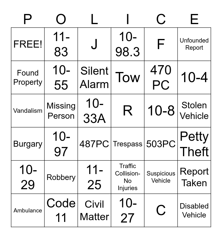 This bingo card has 36 words: Traffic Collision- No Injuries, 11-25, 10-27, Found Property, Burgary, R, 10-55, Civil Matter, F, Suspicious Vehicle, 10-4, 10-98.3, Report Taken, Missing Person, Tow, FREE!, 10-29, 10-8, Vandalism, J, 10-33A, 10-97, Trespass, 487PC, 503PC, 11-83, 470 PC, Code 11, Silent Alarm, Unfounded Report, Disabled Vehicle, Ambulance, Petty Theft, Stolen Vehicle, Robbery and C.