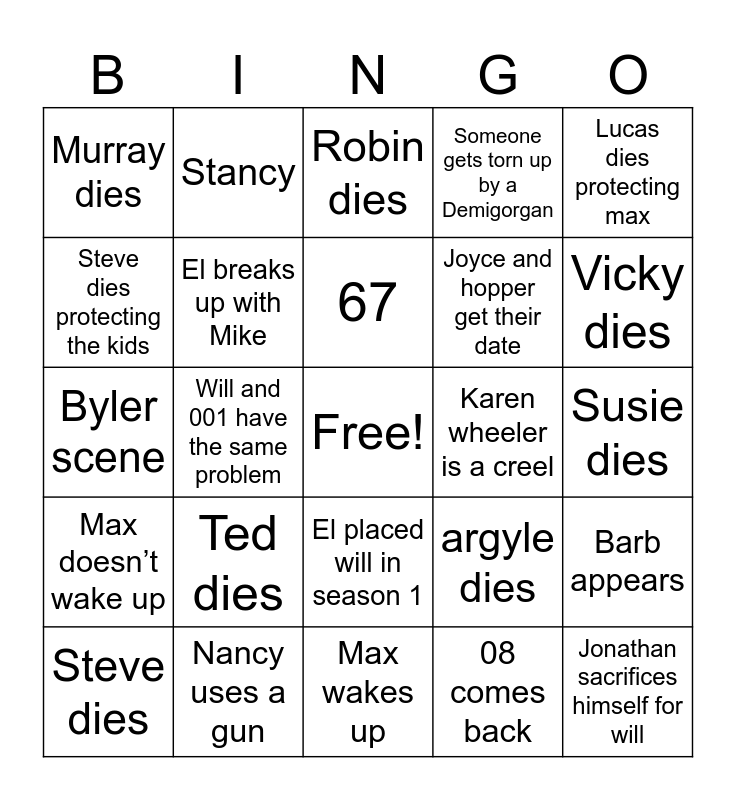 This bingo card has a free space and 24 words: Ted dies, Nancy uses a gun, 67, Steve dies, Lucas dies protecting max, Murray dies, Steve dies protecting the kids, Stancy, Karen wheeler is a creel, El placed will in season 1, Joyce and hopper get their date, Byler scene, argyle dies, Barb appears, El breaks up with Mike, 08 comes back, Susie dies, Robin dies, Vicky dies, Will and 001 have the same problem, Jonathan sacrifices himself for will, Max doesn’t wake up, Someone gets torn up by a Demigorgan and Max wakes up.