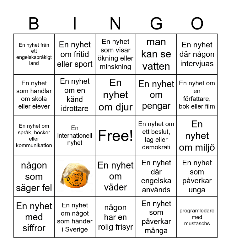 This bingo card has 1 images, a free space and 23 words: En nyhet om något som händer i Sverige, En nyhet om djur, En nyhet med siffror, En nyhet där någon intervjuas, En nyhet från ett engelskspråkigt land, En nyhet som handlar om skola eller elever, En nyhet om fritid eller sport, En nyhet om ett beslut, lag eller demokrati, En nyhet om väder, En nyhet om pengar, En nyhet om språk, böcker eller kommunikation, En nyhet där engelska används, En nyhet som påverkar unga, En nyhet om en känd idrottare, En nyhet som påverkar många, En nyhet om miljö, En nyhet som visar ökning eller minskning, En nyhet om en författare, bok eller film, En internationell nyhet, programledare med mustaschs, någon som säger fel, man kan se vatten and någon har en rolig frisyr.