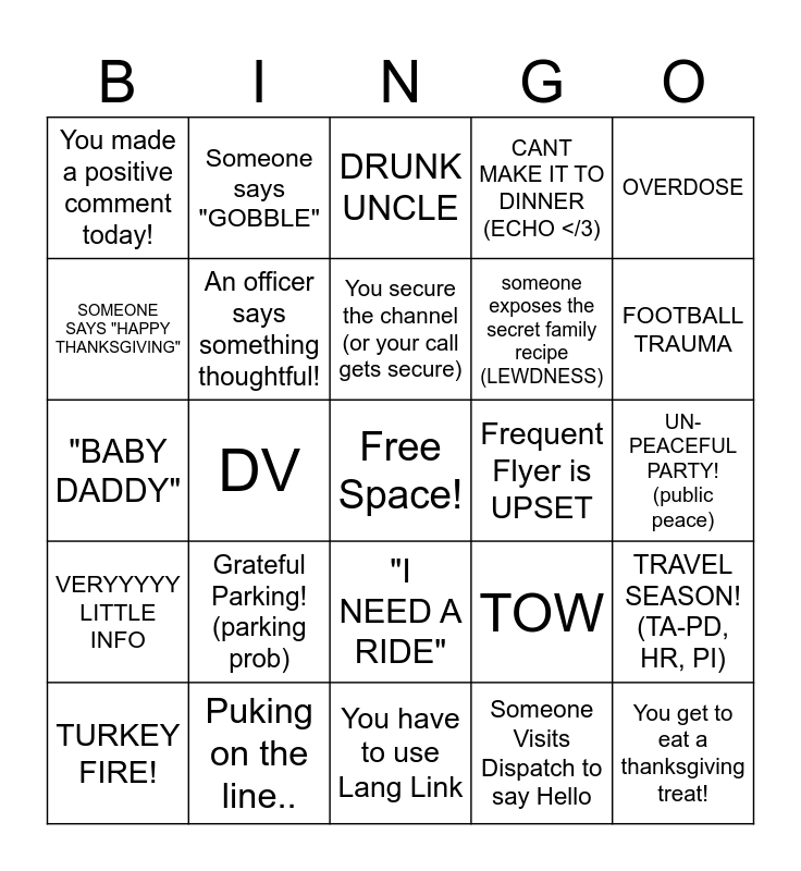This bingo card has a free space and 39 words: Thanksgiving BABY! (child birth), CHOKING (dry turkey), BAKING WHILE BAKED (marijuana smell), An officer says something thoughtful!, TURKEY FIRE!, "I NEED A RIDE", You secure the channel (or your call gets secure), WEAPON!, OVERDOSE, VERYYYYY LITTLE INFO, DV, CANT MAKE IT TO DINNER (ECHO </3), You get to eat a thanksgiving treat!, UN-PEACEFUL PARTY! (public peace), Frequent Flyer is UPSET, Grateful Parking! (parking prob), DUI, You made a positive comment today!, HIKE OFF THE CALORIES (SAR), TOW, SOMEONE SAYS "HAPPY THANKSGIVING", You have to use Lang Link, someone exposes the secret family recipe (LEWDNESS), FOOTBALL TRAUMA, OUTSIDE FIGHT, GOBBLE ROBBER! (Robbery), "Baby MAMA", Frequent Flyer is NICE, I SEE SMOKE, Someone says "GOBBLE", Black Friday made me do it (Theft), YOURE NOT INVITED TO DINNER! (P.O VIOLATION), DRUNK UNCLE, Puking on the line.., Someone Visits Dispatch to say Hello, Crying on the line.., TRAVEL SEASON! (TA-PD, HR, PI), "BABY DADDY" and "We're out of town but..".