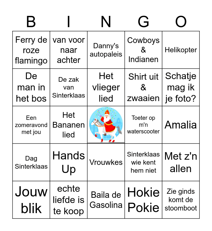 This bingo card has a free space and 50 words: In Spanje, Zie ginds komt de stoomboot, YMCA, Baila de Gasolina, Hands Up, Sinterklaas Kapoentje, van voor naar achter, Oya lélé, De man in het bos, Baby Haai, De zak van Sinterklaas, Cowboys & Indianen, Met z'n allen, Sinterklaas wie kent hem niet, Wy kam fram Fryslân, Terug in de tijd, Het vlieger lied, Toeter op m'n waterscooter, Smurfen lied, Helikopter, Het Bananen lied, Hokie Pokie, Ferry de roze flamingo, Shirt uit & zwaaien, Springen Nondeju, Viva Hollandia, Schatje mag ik je foto?, Dromen dans, Danny's autopaleis, Vrouwkes, Toppertje!, Hartslag van de stad, Hier mag alles, Blikken dag, echte liefde is te koop, Vette boeren, Huisfeestje, Geld maakt niet gelukkig, Sugar daddy, Amalia, Spijt is voor later, Oranje bewaarder, Kleine Vogel, De laatste, Jouw blik, Een zomeravond met jou, Zomernacht in Griekenland, Tranquilo, Dag Sinterklaas and Van brabant naar Bordeaux.