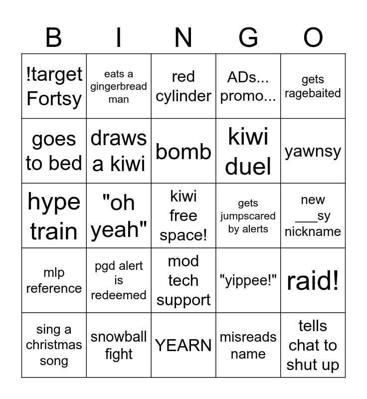 This bingo card has a free space and 24 words: pgd alert is redeemed, snowball fight, bomb, sing a christmas song, gets ragebaited, !target Fortsy, goes to bed, eats a gingerbread man, gets jumpscared by alerts, mod tech support, kiwi duel, hype train, "yippee!", raid!, draws a kiwi, misreads name, new ___sy nickname, red cylinder, yawnsy, "oh yeah", tells chat to shut up, mlp reference, ADs... promo... and YEARN.