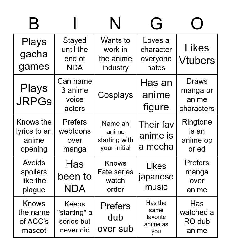 This bingo card has 25 words: Has been to NDA, Prefers dub over sub, Cosplays, Knows the name of ACC's mascot, Likes Vtubers, Plays gacha games, Plays JRPGs, Stayed until the end of NDA, Their fav anime is a mecha, Knows Fate series watch order, Has an anime figure, Knows the lyrics to an anime opening, Likes japanese music, Prefers manga over anime, Can name 3 anime voice actors, Has watched a RO dub anime, Ringtone is an anime op or ed, Wants to work in the anime industry, Draws manga or anime characters, Prefers webtoons over manga, Name an anime starting with your initial, Keeps "starting" a series but never did, Avoids spoilers like the plague, Loves a character everyone hates and Has the same favorite anime as you.