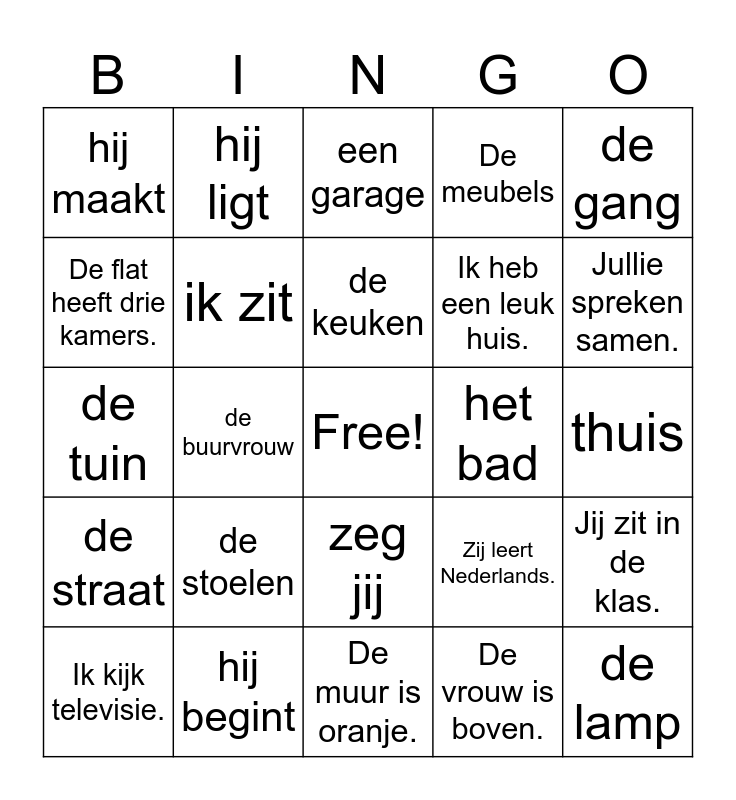 This bingo card has a free space and 40 words: het huis, de tuin, de schuur, ik zit, hij begint, zeg jij, de keuken, de zolder, de gang, de straat, de buurvrouw, De meubels, de lamp, thuis, het bad, de stoelen, zij wonen, hij maakt, jij spreekt, een garage, Jij zit in de klas., De vrouw is boven., Ik heb een leuk huis., De flat heeft drie kamers., Het is hier gezellig., Mijn nieuwe buurman heet Mark., Drink je een kopje koffie?, Ik kom niet thuis., Waar is de kast?, De douche is in de badkamer., De tafel staat in de keuken., Ik kijk televisie., Het kind ligt in bed., Zij leert Nederlands., Jullie spreken samen., De muur is oranje., De lamp is zwart., zij lacht, hij ligt and ik pak.