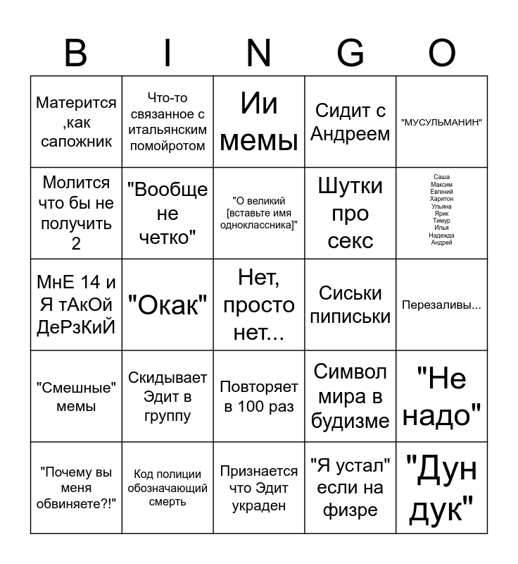 This bingo card has a free space and 25 words: Скидывает Эдит в группу, Признается что Эдит украден, "О великий [вставьте имя одноклассника]", "Почему вы меня обвиняете?!", "МУСУЛЬМАНИН", Матерится ,как сапожник, Молится что бы не получить 2, Что-то связанное с итальянским помойротом, Сиськи пиписьки, Повторяет в 100 раз, Шутки про секс, МнЕ 14 и Я тАкОй ДеРзКиЙ, Символ мира в будизме, "Не надо", "Вообще не четко", "Глава шопа..", Перезаливы..., Ии мемы, Саша Максим Евгений Харитон Ульяна Ярик Тимур Илья Надежда Андрей, "Окак", "Дун дук", Код полиции обозначающий смерть, "Смешные" мемы, Сидит с Андреем and "Я устал" если на физре.