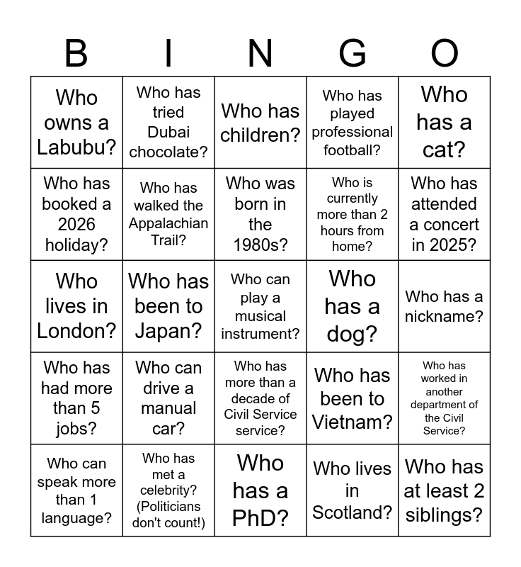 This bingo card has 25 words: Who can drive a manual car?, Who has a PhD?, Who was born in the 1980s?, Who can speak more than 1 language?, Who has a cat?, Who owns a Labubu?, Who has booked a 2026 holiday?, Who has tried Dubai chocolate?, Who has a dog?, Who has more than a decade of Civil Service service?, Who is currently more than 2 hours from home?, Who lives in London?, Who has been to Vietnam?, Who has worked in another department of the Civil Service?, Who has walked the Appalachian Trail?, Who has at least 2 siblings?, Who has a nickname?, Who has children?, Who has attended a concert in 2025?, Who has been to Japan?, Who can play a musical instrument?, Who has met a celebrity? (Politicians don't count!), Who has had more than 5 jobs?, Who has played professional football? and Who lives in Scotland?.