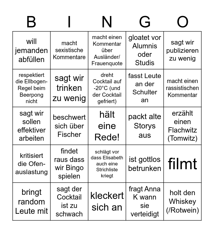 This bingo card has a free space and 24 words: findet raus dass wir Bingo spielen, sagt der Cocktail ist zu schwach, dreht Cocktail auf -20°C (und der Cocktail gefriert), bringt random Leute mit, sagt wir publizieren zu wenig, will jemanden abfüllen, respektiert die Ellbogen-Regel beim Beerpong nicht, macht sexistische Kommentare, packt alte Storys aus, schlägt vor dass Elisabeth auch eine Strichliste kriegt, fasst Leute an der Schulter an, sagt wir sollen effektiver arbeiten, ist gottlos betrunken, filmt, sagt wir trinken zu wenig, fragt Anna K wann sie verteidigt, erzählt einen Flachwitz (Tomwitz), macht einen Kommentar über Ausländer/ Frauenquote, macht einen rassistischen Kommentar, beschwert sich über Fischer, holt den Whiskey (/Rotwein), kritisiert die Ofen- auslastung, gloatet vor Alumnis oder Studis and kleckert sich an.