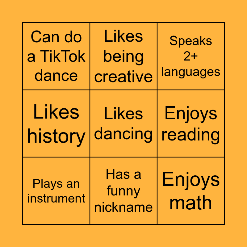 This bingo card has 17 words: Likes singing, Has a pet, Speaks 2+ languages, Can do a TikTok dance, Plays a teamsport, Likes history, Is fan of a music artist/band, Plays an instrument, Has a funny nickname, Enjoys reading, Likes spicy food, Has baked/cooked something this month, Likes dancing, Likes being creative, Enjoys math, Likes video games and Is wearing mismatched socks.