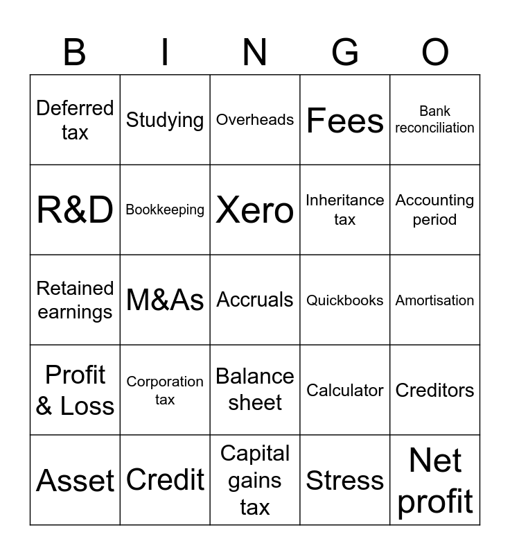 This bingo card has 48 words: Debtors, Accruals, Excel, Capital gains tax, Corporation tax, Personal tax, Studying, Accountancy, R&D, Payroll, Bookkeeping, Fees, Creditors, Calculator, UHY, Sage, Xero, Quickbooks, Deadlines, Bank reconciliation, M&As, Stress, Deferred tax, Inheritance tax, S455, Accounting period, Asset, Liability, Balance sheet, Profit & Loss, Capital, Cash Flow, Chart of accounts, Stock, Credit, Debit, Depreciation, Amortisation, Dividend, General ledger, Gross profit, Net profit, Overheads, Cost of sales, Retained earnings, Revenue, Trial balance and BADR.