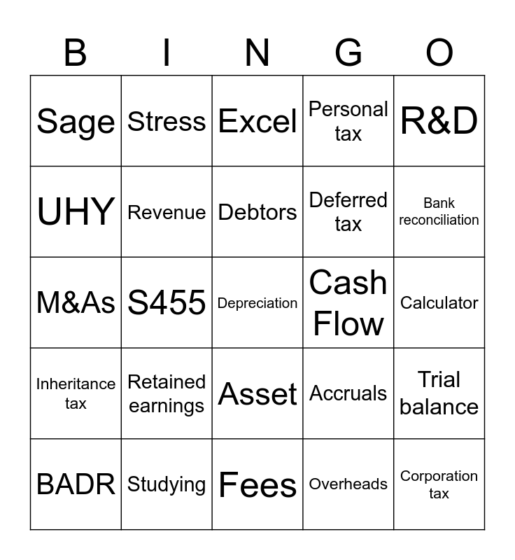 This bingo card has 48 words: Profit & Loss, Depreciation, Accountancy, Fees, Retained earnings, Quickbooks, Stress, Capital gains tax, UHY, General ledger, Revenue, Personal tax, Trial balance, Accruals, Creditors, Chart of accounts, Debtors, Cash Flow, Dividend, R&D, S455, Overheads, Sage, Deferred tax, Balance sheet, Bank reconciliation, BADR, Net profit, Asset, Inheritance tax, Liability, Amortisation, Xero, Bookkeeping, Studying, Cost of sales, Accounting period, Calculator, Stock, Capital, Debit, Corporation tax, Excel, Deadlines, M&As, Payroll, Credit and Gross profit.