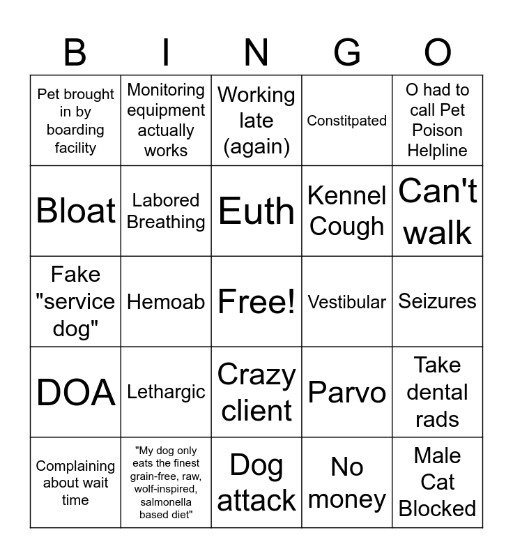This bingo card has a free space and 39 words: FB, ADR, Vomiting and Diarrhea, Labored Breathing, Complaining about wait time, Crazy client, Euth, Not eating or drinking, O had to call Pet Poison Helpline, DOA, Hemoab, Constitpated, Male Cat Blocked, Seizures, Vestibular, Lethargic, Allergic Reaction, Pet brought in by boarding facility, THC ingestion, Parvo, Bloat, Dog attack, Kennel Cough, Can't walk, Big untrained dog on a flexi lead, Client just wants meds, "I just noticed it yesterday", "Emergency vax" for boarding, "He doesn't bite", Monitoring equipment actually works, You smell the parvo, Client sent uninformed husband, Working late (again), "My dog only eats the finest grain-free, raw, wolf-inspired, salmonella based diet", No money, Pick up a heart murmur, Take dental rads, Fake "service dog" and O making out with dog in room.