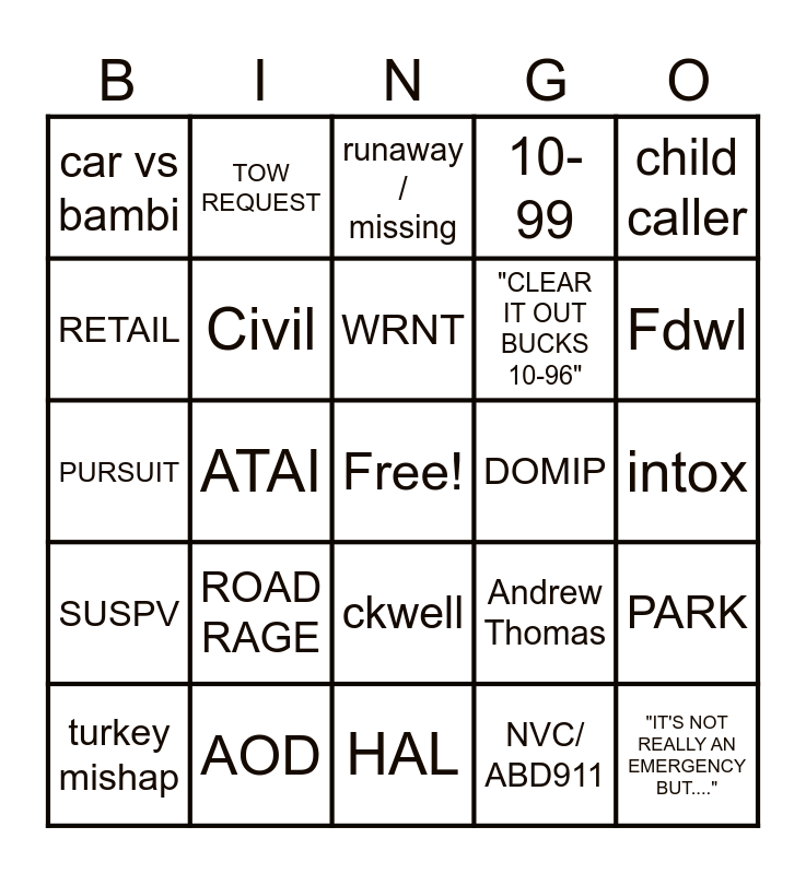 This bingo card has a free space and 29 words: turkey mishap, cardiac, ATAI, lift assist, car vs bambi, runaway / missing, Civil, ROAD RAGE, DOMIP, AOD, intox, "IT'S NOT REALLY AN EMERGENCY BUT....", HAL, NVC/ ABD911, Fdwl, armed, ckwell, SUSPV, child caller, PURSUIT, Andrew Thomas, BLAC, "CLEAR IT OUT BUCKS 10-96", RETAIL, 10-99, TOW REQUEST, PARK, WRNT and VIPER HIT.