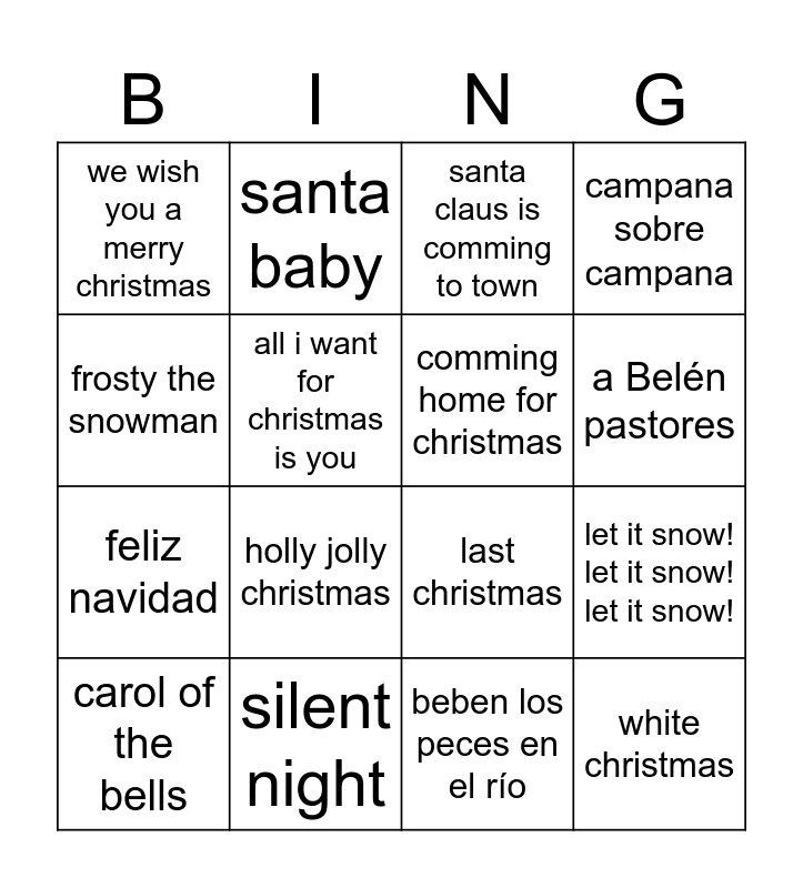 This bingo card has 20 words: let it snow! let it snow! let it snow!, it's beginning to look like christmas, santa claus is comming to town, jingle bells, carol of the bells, frosty the snowman, silent night, we wish you a merry christmas, feliz navidad, santa baby, holly jolly christmas, last christmas, all i want for christmas is you, white christmas, comming home for christmas, deck the halls, a Belén pastores, campana sobre campana, beben los peces en el río and burrito sabanero.
