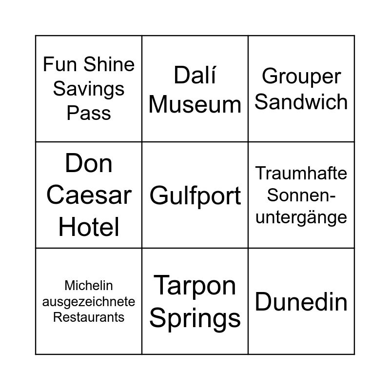 This bingo card has 24 words: St. Pete Pride, Manatees, Tarpon Springs, St. Pete City Pier, Gulfport, Fun Shine Savings Pass, Traumhafte Sonnen-untergänge, Dalí Museum, Clear-water Beach, 56 km lange Traum-strände, Dunedin, Delfine, Gulf Coast Program, St. Pete Beach, Michelin ausgezeichnete Restaurants, Tampa Bay International Airport, Murals, Grouper Sandwich, Die beliebtesten Strände der USA, St. Petersburg (“St. Pete”), Pier 60, Craft Beer Brauereien, Don Caesar Hotel and Chihuly Collection.