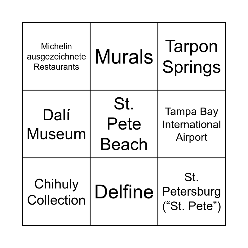 This bingo card has 24 words: 56 km lange Traum-strände, Dunedin, Delfine, Gulf Coast Program, St. Pete Beach, Michelin ausgezeichnete Restaurants, Tampa Bay International Airport, Murals, Grouper Sandwich, Die beliebtesten Strände der USA, St. Petersburg (“St. Pete”), Pier 60, Craft Beer Brauereien, Don Caesar Hotel, Chihuly Collection, St. Pete Pride, Manatees, Tarpon Springs, St. Pete City Pier, Gulfport, Fun Shine Savings Pass, Traumhafte Sonnen-untergänge, Dalí Museum and Clear-water Beach.