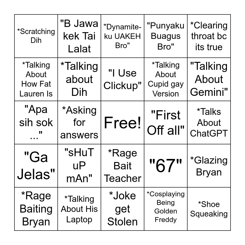 This bingo card has a free space and 24 words: *Rage Baiting Bryan, "sHuT uP mAn", "I Use Clickup", *Cosplaying Being Golden Freddy, *Clearing throat bc its true, *Scratching Dih, "B Jawa kek Tai Lalat, "Dynamite-ku UAKEH Bro", "First Off all", *Talks About ChatGPT, "Apa sih sok ...", *Talking about Dih, "67", *Glazing Bryan, *Talking About How Fat Lauren Is, *Talking About His Laptop, *Joke get Stolen, "Punyaku Buagus Bro", "Talking About Gemini", "Ga Jelas", *Asking for answers, *Rage Bait Teacher, *Talking About Cupid gay Version and *Shoe Squeaking.