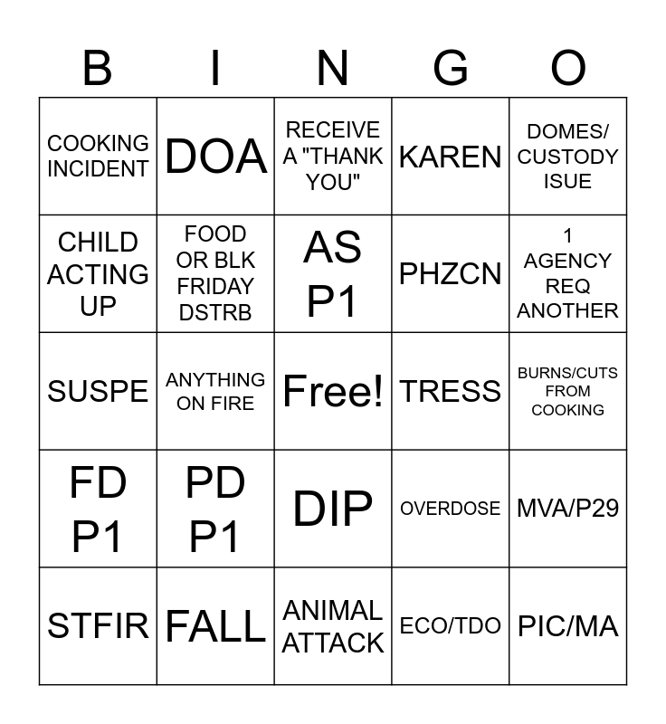 This bingo card has a free space and 24 words: PD P1, FALL, AS P1, STFIR, DOMES/ CUSTODY ISUE, COOKING INCIDENT, CHILD ACTING UP, DOA, TRESS, DIP, PHZCN, SUSPE, OVERDOSE, MVA/P29, FOOD OR BLK FRIDAY DSTRB, ECO/TDO, BURNS/CUTS FROM COOKING, RECEIVE A "THANK YOU", 1 AGENCY REQ ANOTHER, ANYTHING ON FIRE, PIC/MA, FD P1, KAREN and ANIMAL ATTACK.