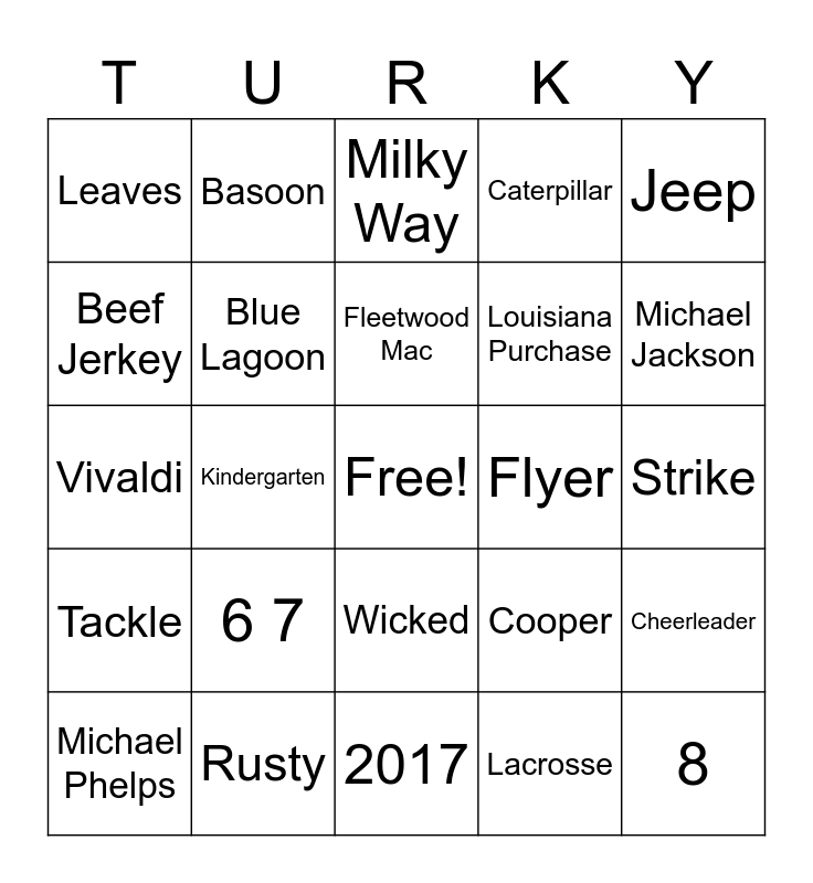 This bingo card has a free space and 51 words: 70%, 8, 16, 2017, 6 7, Aretha Franklin, Basoon, Bay Bridge, Beef Jerkey, Bip, Blue Lagoon, Caterpillar, Cheerleader, Cooper, Eagle, Eisenhower, Fleetwood Mac, Flyer, Ithica, NY, Jeep, Kindergarten, Lacrosse, Leaves, Louisiana Purchase, Mac and Cheese, Manure, Michael Jackson, Michael Jordan, Michael Phelps, Milky Way, Moonlight Maidens, one sixth, Pastitio, Patriots, Pizza & Spaghetti, Rusty, Saturn, Second Amendment, Smell, Steelers, Strike, Tackle, Today!, Twizzlers, UCLA, Viola, Vivaldi, Volleyball, Waffles, Wicked and Wrestling.