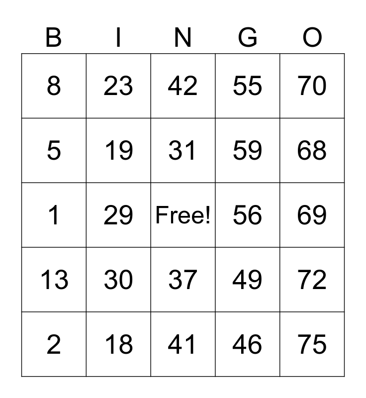 This bingo card has a free space and 24 words: 2, 30, 31, 46, 70, 8, 23, 42, 56, 69, 1, 19, 49, 72, 5, 18, 41, 55, 68, 13, 29, 37, 59 and 75.