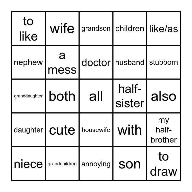 This bingo card has 28 words: my half-brother, my friend, husband, son, nephew, grandson, wife, daughter, half-sister, niece, granddaughter, children, grandchildren, annoying, stubborn, naughty, cute, a mess, doctor, housewife, to like, to draw, all, both, also, with, like/as and really.