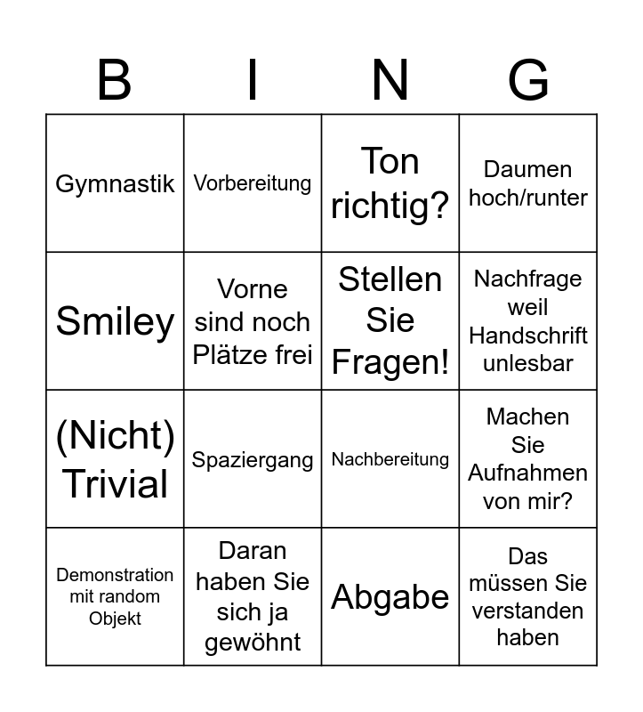 This bingo card has 16 words: Daran haben Sie sich ja gewöhnt, Machen Sie Aufnahmen von mir?, Ton richtig?, Gymnastik, (Nicht) Trivial, Vorbereitung, Nachbereitung, Abgabe, Smiley, Vorne sind noch Plätze frei, Demonstration mit random Objekt, Daumen hoch/runter, Spaziergang, Nachfrage weil Handschrift unlesbar, Stellen Sie Fragen! and Das müssen Sie verstanden haben.