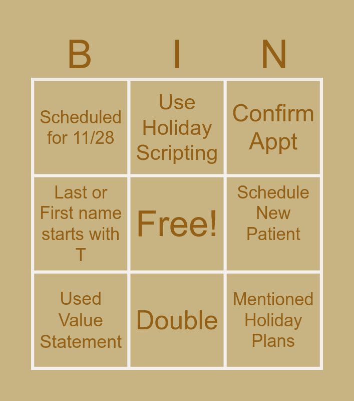 This bingo card has a free space and 8 words: Schedule New Patient, Confirm Appt, Use Holiday Scripting, Used Value Statement, Scheduled for 11/28, Mentioned Holiday Plans, Last or First name starts with T and Double.