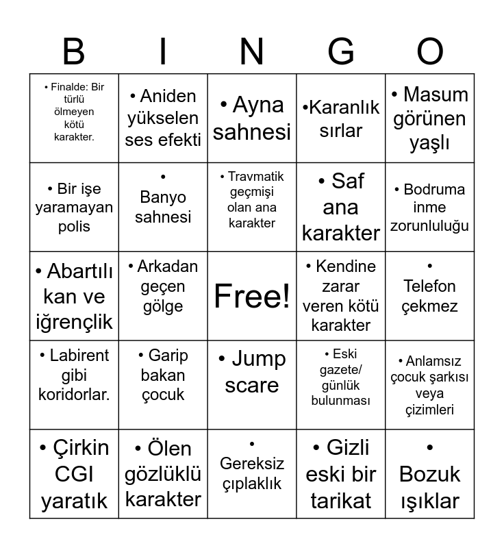 This bingo card has a free space and 24 words: • Garip bakan çocuk, • Ölen gözlüklü karakter, • Travmatik geçmişi olan ana karakter, • Çirkin CGI yaratık, • Masum görünen yaşlı, • Finalde: Bir türlü ölmeyen kötü karakter., • Bir işe yaramayan polis, • Aniden yükselen ses efekti, • Kendine zarar veren kötü karakter, • Jump scare, • Saf ana karakter, • Abartılı kan ve iğrençlik, • Eski gazete/ günlük bulunması, • Anlamsız çocuk şarkısı veya çizimleri, • Banyo sahnesi, • Gizli eski bir tarikat, • Telefon çekmez, • Ayna sahnesi, • Bodruma inme zorunluluğu, • Arkadan geçen gölge, • Bozuk ışıklar, • Labirent gibi koridorlar., •Karanlık sırlar and • Gereksiz çıplaklık.