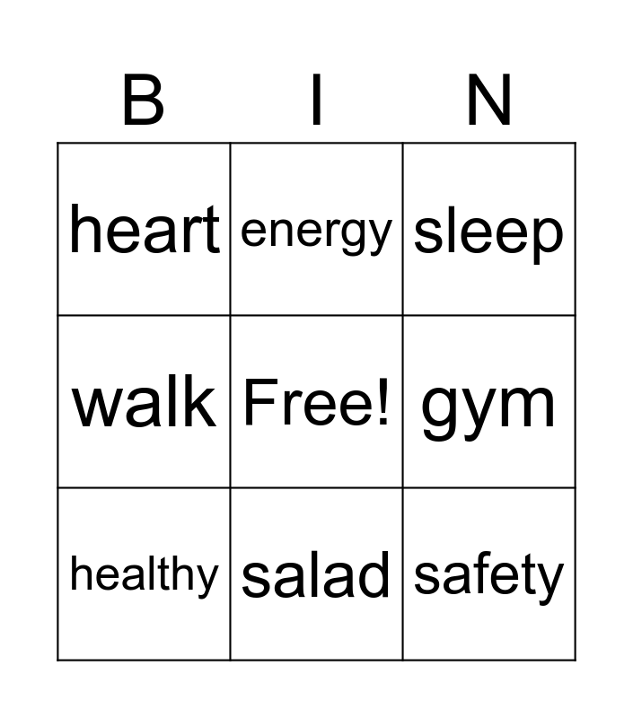 This bingo card has a free space and 9 words: healthy, sleep, energy, walk, heart, gym, safety, water and salad.