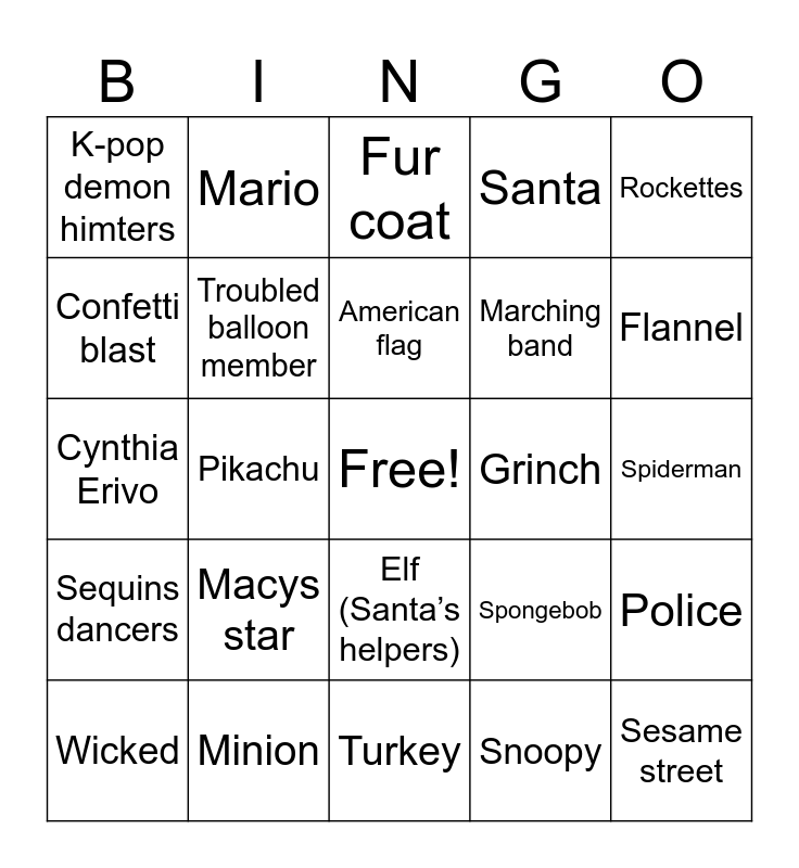 This bingo card has a free space and 24 words: Macys star, Minion, American flag, Wicked, Rockettes, K-pop demon himters, Confetti blast, Mario, Grinch, Elf (Santa’s helpers), Marching band, Cynthia Erivo, Spongebob, Police, Troubled balloon member, Snoopy, Spiderman, Fur coat, Flannel, Pikachu, Sesame street, Sequins dancers, Santa and Turkey.