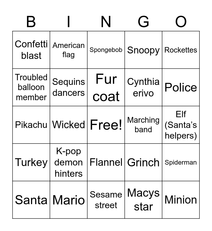 This bingo card has a free space and 24 words: K-pop demon hinters, Mario, Fur coat, Santa, Rockettes, Confetti blast, Troubled balloon member, American flag, Marching band, Flannel, Cynthia erivo, Pikachu, Grinch, Spiderman, Sequins dancers, Macys star, Elf (Santa’s helpers), Spongebob, Police, Wicked, Minion, Turkey, Snoopy and Sesame street.