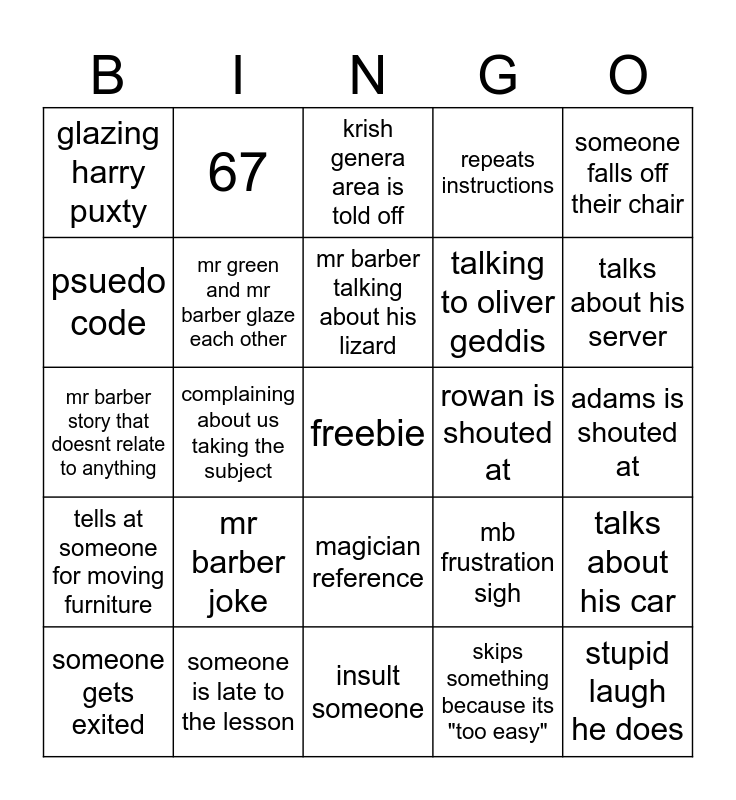 This bingo card has a free space and 24 words: mr barber joke, someone is late to the lesson, mr barber talking about his lizard, someone gets exited, someone falls off their chair, glazing harry puxty, psuedo code, 67, rowan is shouted at, magician reference, talking to oliver geddis, mr barber story that doesnt relate to anything, mb frustration sigh, talks about his car, mr green and mr barber glaze each other, skips something because its "too easy", adams is shouted at, krish genera area is told off, talks about his server, complaining about us taking the subject, stupid laugh he does, tells at someone for moving furniture, repeats instructions and insult someone.