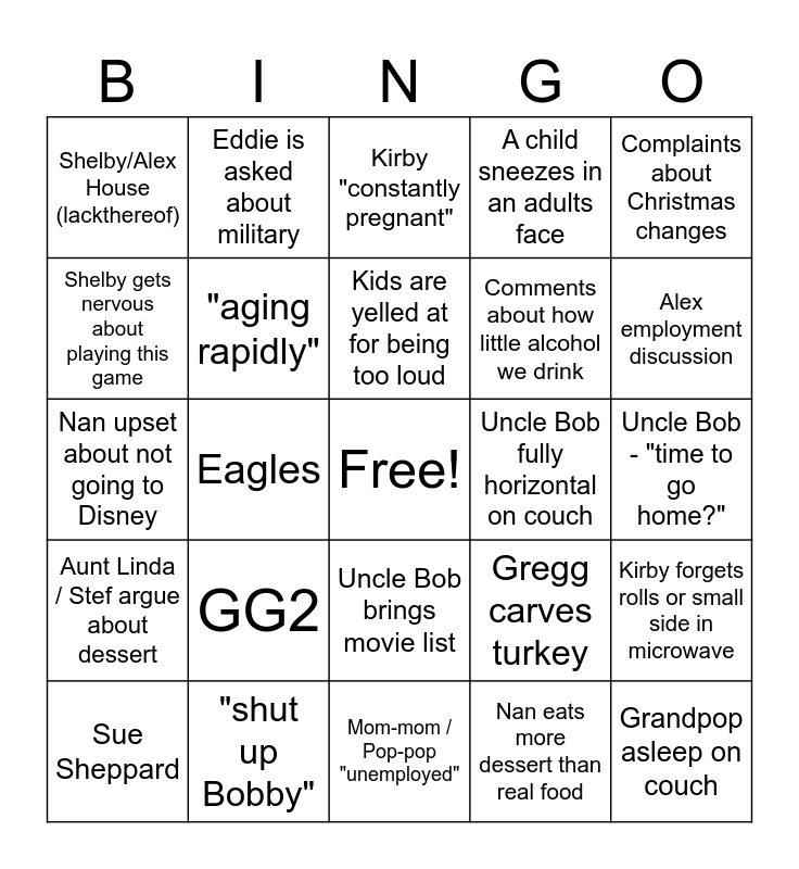 This bingo card has a free space and 29 words: Sue Sheppard, Trump, Eagles, Uncle Bob's Allergy, Shelby/Alex House (lackthereof), Kirby "constantly pregnant", "aging rapidly", GG2, Uncle Bob fully horizontal on couch, "shut up Bobby", Uncle Bob - "time to go home?", Grandpop asleep on couch, Mom-mom / Pop-pop "unemployed", Nan eats more dessert than real food, Alex employment discussion, "you keep having all these children", Uncle Bob brings movie list, Aunt Linda / Stef argue about dessert, Complaints about Christmas changes, Nan upset about not going to Disney, Gregg carves turkey, Gregg does not carve turkey, Comments about how little alcohol we drink, Shelby gets nervous about playing this game, A child sneezes in an adults face, Eddie is asked about military, Kirby forgets rolls or small side in microwave, Kids are yelled at for being too loud and Olive or Charlotte in tears.