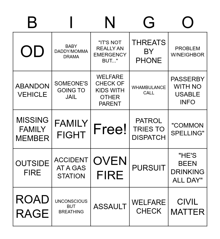 This bingo card has a free space and 34 words: PROBLEMS WITH JUVENILE, WELFARE CHECK, 911 OPEN LINE, BARKING DOG, OUTSIDE FIRE, SOMEONE'S GOING TO JAIL, PROBLEM W/NEIGHBOR, ROAD RAGE, BABY DADDY/MOMMA DRAMA, DISCON IN GROCERY STORE, WELFARE CHECK OF KIDS WITH OTHER PARENT, "IT'S NOT REALLY AN EMERGENCY BUT...", SMOKE ALARM COOKING TIMER, ENTRY/EXIT ALARM, PATROL TRIES TO DISPATCH, PASSERBY WITH NO USABLE INFO, UNCONSCIOUS BUT BREATHING, MISSING FAMILY MEMBER, ACCIDENT AT A GAS STATION, PURSUIT, OVEN FIRE, SHOTS FIRED/FIREWORKS, OD, "COMMON SPELLING", ASSAULT, CIVIL MATTER, THREATS BY PHONE, SUSP PERSON/VEHICLE, WHAMBULANCE CALL, ABANDON VEHICLE, WRECKER REQUEST, FAMILY FIGHT, "HE'S BEEN DRINKING ALL DAY" and STROKE ON THE RADIO.