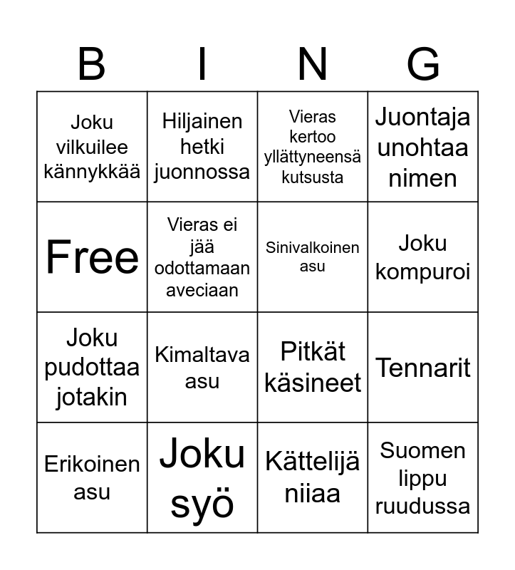 This bingo card has 36 words: Antava kaula-aukko, Kiistämättä ruma asu, Kättelijä jää jutustelemaan, Sinivalkoinen asu, "Suuri kunnia", Suomen lippu ruudussa, Joku kompuroi, Erikoinen päähine/hiuskoriste, Free, Kansallispuku jollain, Tennarit, Juontaja unohtaa nimen, Joku mainitsee veteraanit, Joku syö, Kimaltava asu, Joku vilkuilee kännykkää, Juontaja toteaa "näyttävä asu", Asu, jossa enemmän kuin kolme väriä, Erikoinen asu, Vieras kertoo yllättyneensä kutsusta, Kättelijä niiaa, Kättelijä kumartaa, Taitelijaa haastatellaan, Pinkki iltapuku, Juontaja sanoo "perinteisesti", Hiljainen hetki juonnossa, Pitkät käsineet, Kuvataan kynttilää, Joku pudottaa jotakin, Vieras ei jää odottamaan aveciaan, Joku ei kättele presidenttiparia, Joku jää juttelemaan presidentin kanssa, Naisoletetulla housupuku, Linnan booli mainitaan, "Mitä itsenäisyys teille merkitsee?" and Tatuointi näkyy.
