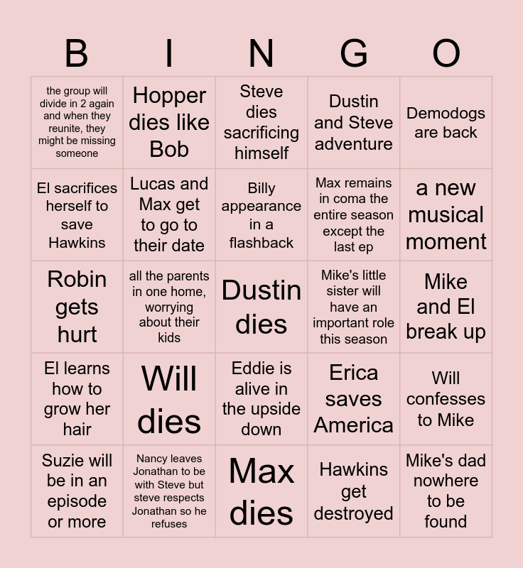 This bingo card has a free space and 24 words: Will dies, Nancy leaves Jonathan to be with Steve but steve respects Jonathan so he refuses, Billy appearance in a flashback, Suzie will be in an episode or more, Demodogs are back, the group will divide in 2 again and when they reunite, they might be missing someone, El sacrifices herself to save Hawkins, Hopper dies like Bob, Mike's little sister will have an important role this season, Eddie is alive in the upside down, Max remains in coma the entire season except the last ep, Robin gets hurt, Erica saves America, Will confesses to Mike, Lucas and Max get to go to their date, Hawkins get destroyed, Mike and El break up, Steve dies sacrificing himself, a new musical moment, all the parents in one home, worrying about their kids, Mike's dad nowhere to be found, El learns how to grow her hair, Dustin and Steve adventure and Max dies.