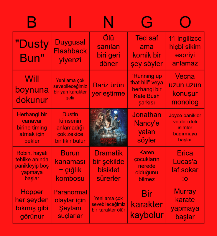 This bingo card has a free space and 24 words: Burun kanaması + çığlık kombosu, Paranormal olaylar için Şeytanı suçlarlar, Bariz ürün yerleştirme, Hopper her şeyden bıkmış gibi görünür, 11 ingilizce hiçbi sikim espriyi anlamaz, "Dusty Bun", Will boynuna dokunur, Duygusal Flashback yiyenzi, Jonathan Nancy'e yalan söyler, Dramatik bir şekilde bisiklet sürerler, "Running up that hill" veya herhangi bir Kate Bush şarkısı, Herhangi bir canavar birine timing atmak için bekler, Karen çocukların nerede olduğunu bilmez, Erica Lucas'a laf sokar :o, Yeni ama çok sevebileceğimiz bir yan karakter gelir, Bir karakter kaybolur, Joyce panikler ve deli deli isimler bağırmaya başlar, Ölü sanılan biri geri döner, Vecna uzun uzun konuşur monolog, Dustin kimsenin anlamadığı çok zekice bir fikir bulur, Murray karate yapmaya başlar, Robin, hayati tehlike anında panikleyip boş yapmaya başlar, Ted saf ama komik bir şey söyler and Yeni ama çok sevebileceğimiz bir karakter ölür.