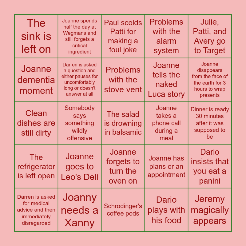 This bingo card has 37 words: Expired food, Dario and Joanne argue in the kitchen, Dario criticizes Julie's work schedule and/or weight, Darren is asked a question and either pauses for uncomfortably long or doesn't answer at all, Dario insists that you eat a panini, Joanne goes to Leo's Deli, Problems with the stove vent, Darren rests his eyes, Julie, Patti, and Avery go to Target, Joanne is worried about Dario, Somebody says something wildly offensive, Problems with the alarm system, The salad is drowning in balsamic, Dinner is ready 30 minutes after it was supposed to be, Joanne dementia moment, The refrigerator is left open, Politics, Paul scolds Patti for making a foul joke, Joanne forgets to turn the oven on, Joanne takes a phone call during a meal, The sink is left on, Joanne disappears from the face of the earth for 3 hours to wrap presents, Darren is asked for medical advice and then immediately disregarded, Schrodinger's coffee pods, Joanne's ringer is at max volume for more than 5 seconds, Dario plays with his food, Joanne spends half the day at Wegmans and still forgets a critical ingredient, Dario falls asleep, Joanne takes awkward candids in the middle of a conversation, Dario gets dessert on his hands, Dario wood chips the snacks, Joanny needs a Xanny, Clean dishes are still dirty, Jeremy magically appears, Joanne has plans or an appointment, Joanne tells the naked Luca story and That goddamn clock goes off in the middle of a conversation.
